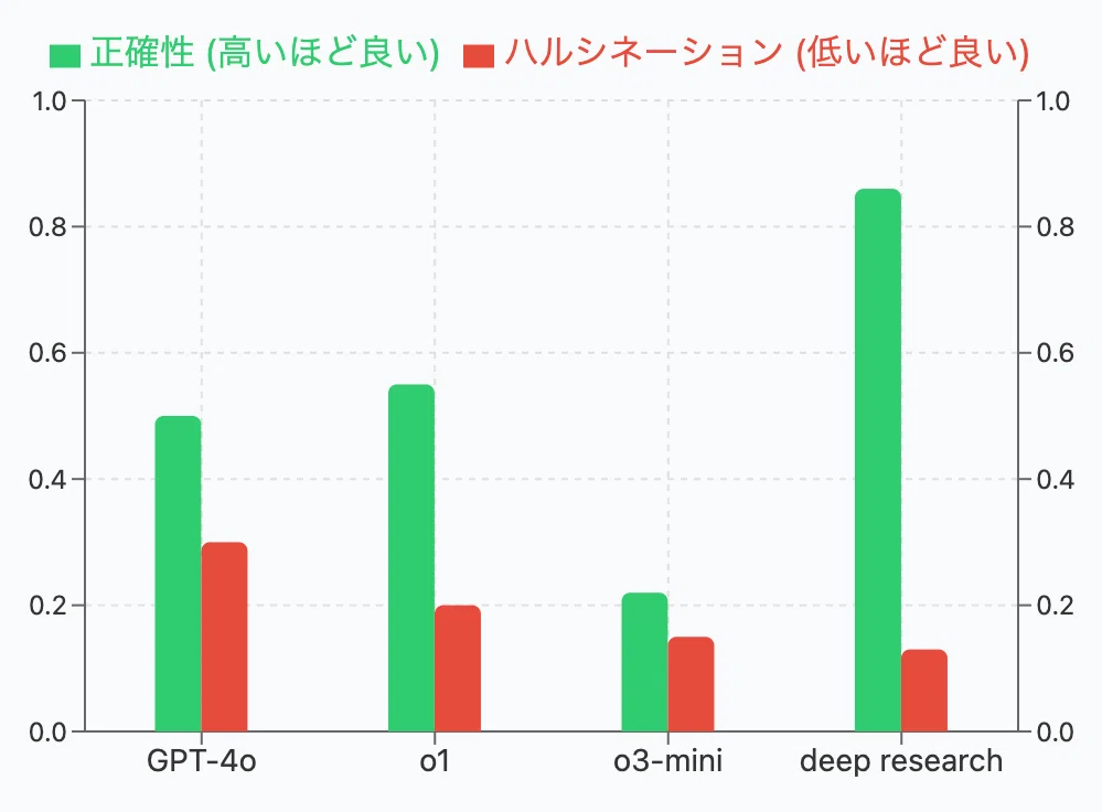 Deep Reseach の最大の特徴は、「正確性が高く、ハルシネーションを起こしにくい」ことです。Open AI が公開した調査結果は以下の通りです。