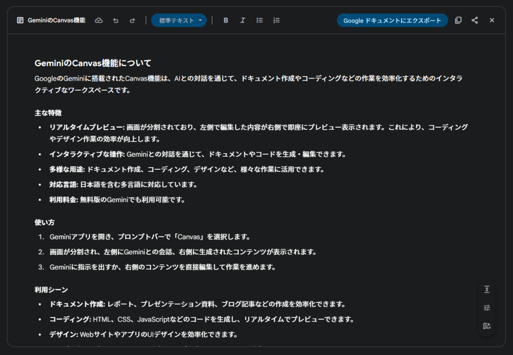 GeminiのCanvas特有の機能としては「Googleドキュメントにエクスポート」できる点があります。